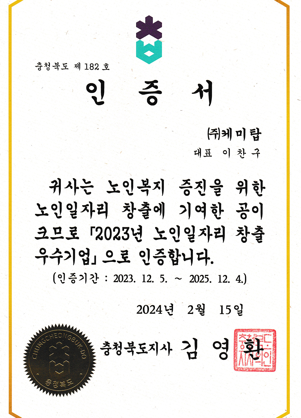 노인 일자리 창출 기업 인증서